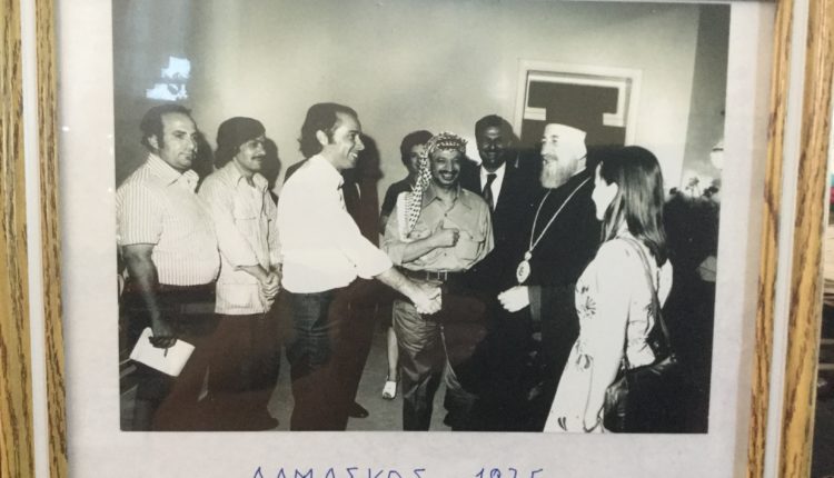 في الصورة الأسقف مكاريوس والرئيس عرفات والسفير ملحم مسعود