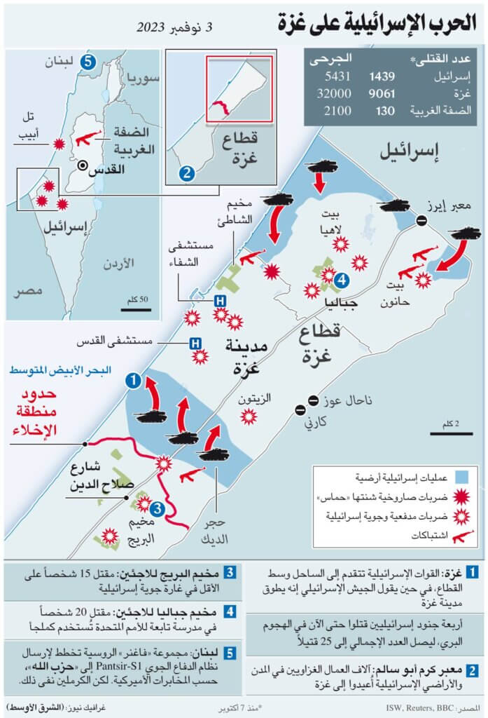 تواصل القتال في اليوم الـ33 للحرب على قطاع غزة في جميع المحاور واحتدمت المعارك، وكثفت طائرات الاحتلال هجماتها لمساعدة قوات الجيش على مواصلة التقدم في غرب مدينة غزة، بهدف إلحاق أضرار بأنفاق المقاومة وزيادة الضغط على مراكز القيادة والسيطرة. وسط حركة نزوح واسعة للسكان نحو الجزء الجنوبي من قطاع غزة، حيث قامت قوات الاحتلال بفتح “ممر آمن” على شارع صلاح الدين، بهدف انتقال المزيد من السكان المدنيين للسماح بمزيد من حرية العمل للقوات في الميدان.