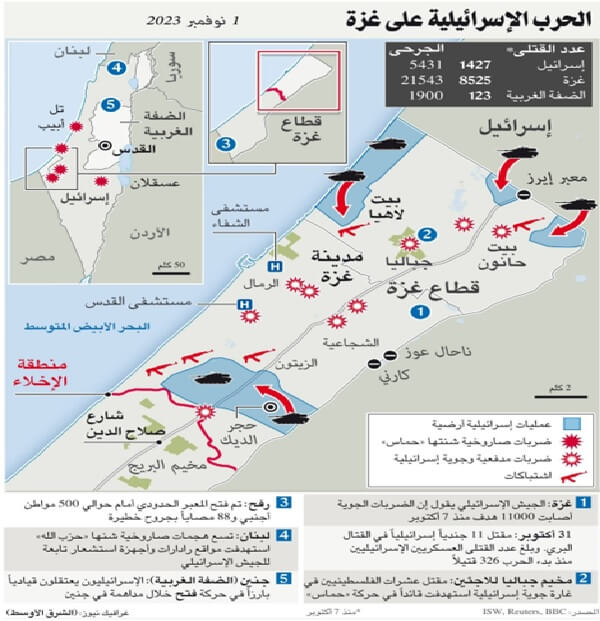 - احتدمت المعارك البرية، الأربعاء 1-11-2023، على 4 محاور في قطاع غزة مع محاولة الجيش الإسرائيلي التقدم، على عدة محاور (راجع الخريطة المرفقة):