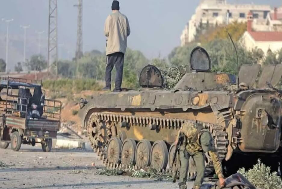 في قاعدة عسكرية للتدريب والاستعراضات بشمال سوريا، كانت هناك أكثر من 50 دبابة وعربة عسكرية مهجورة، سيطر عليها المسلحون المعارضون لنظام بشار الأسد في هجومهم السريع.